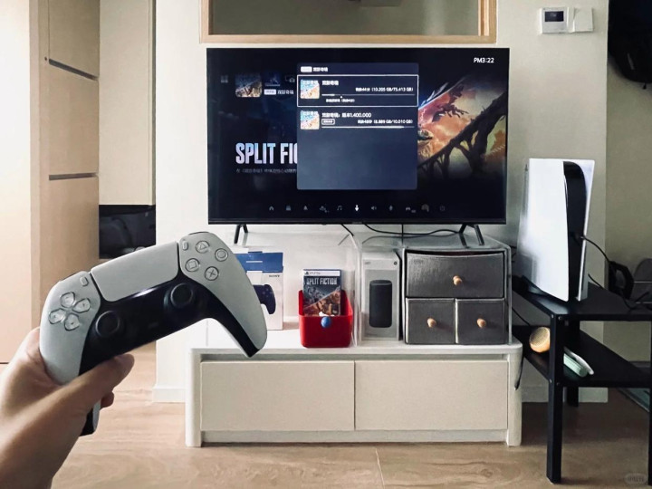 电视背景墙底下放置一张落地式白色电视柜,底部不会积灰,上部还安装了一个亚克力置物架,将中部利用起来,摆放一些游戏相关的物品,上面还可以直接放置电视,有一种悬浮的感觉。这就将空间充分利用起来了。