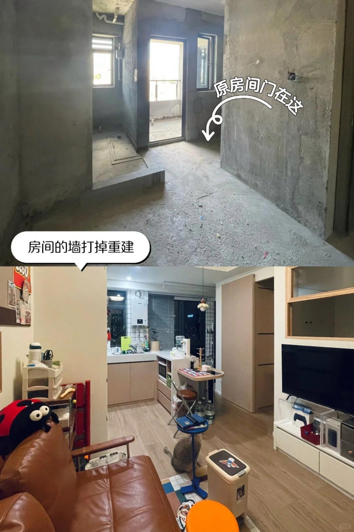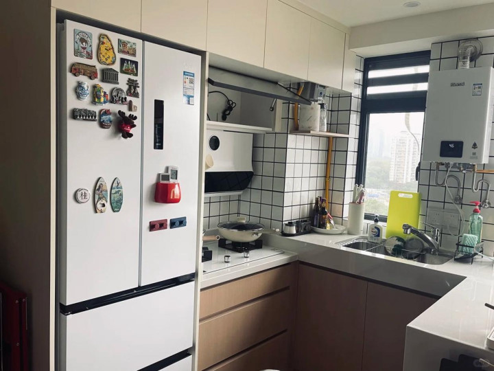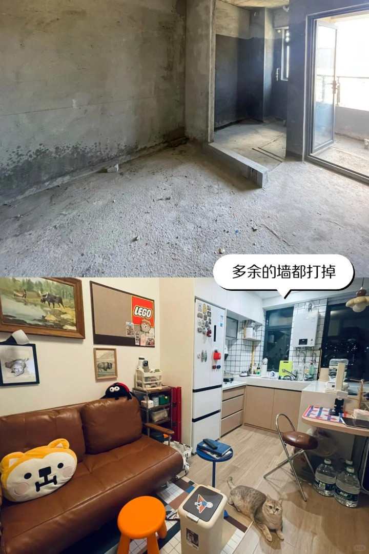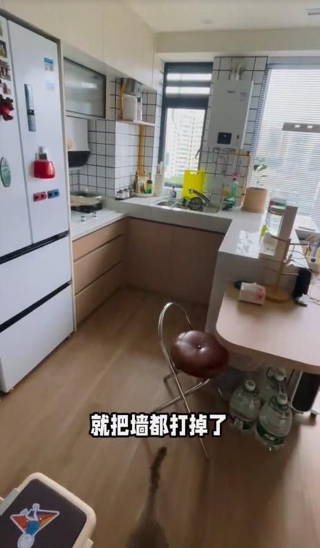 客厅对面就是厨房了。厨房原本的户型是封闭式的,但是因为屋内采光一般,如果做封闭式,室内就会比较昏暗,因此博主直接将这面墙拆掉,将厨房设计成开放式的;