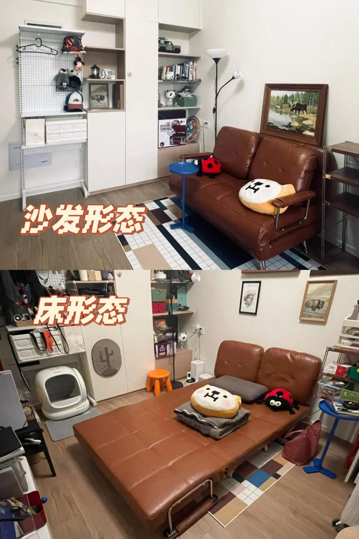 而最特别的一点就是,这个双人座沙发其实是一个折叠沙发,将它直接伸展开,就可以变成一张双人床。因此,客厅也可以当成客卧,平时家里来朋友也可以在这里进行临时休息。
