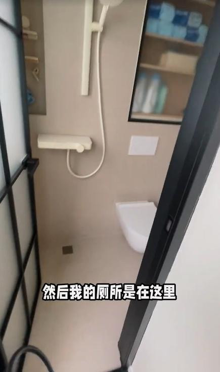 厨房旁边就是阳台,最内侧就是卫生间,卫生间安放在最里面,因为空间较小,所以只有花洒与马桶,并将马桶的水箱直接内嵌在里面,将这些空间隐藏起来;